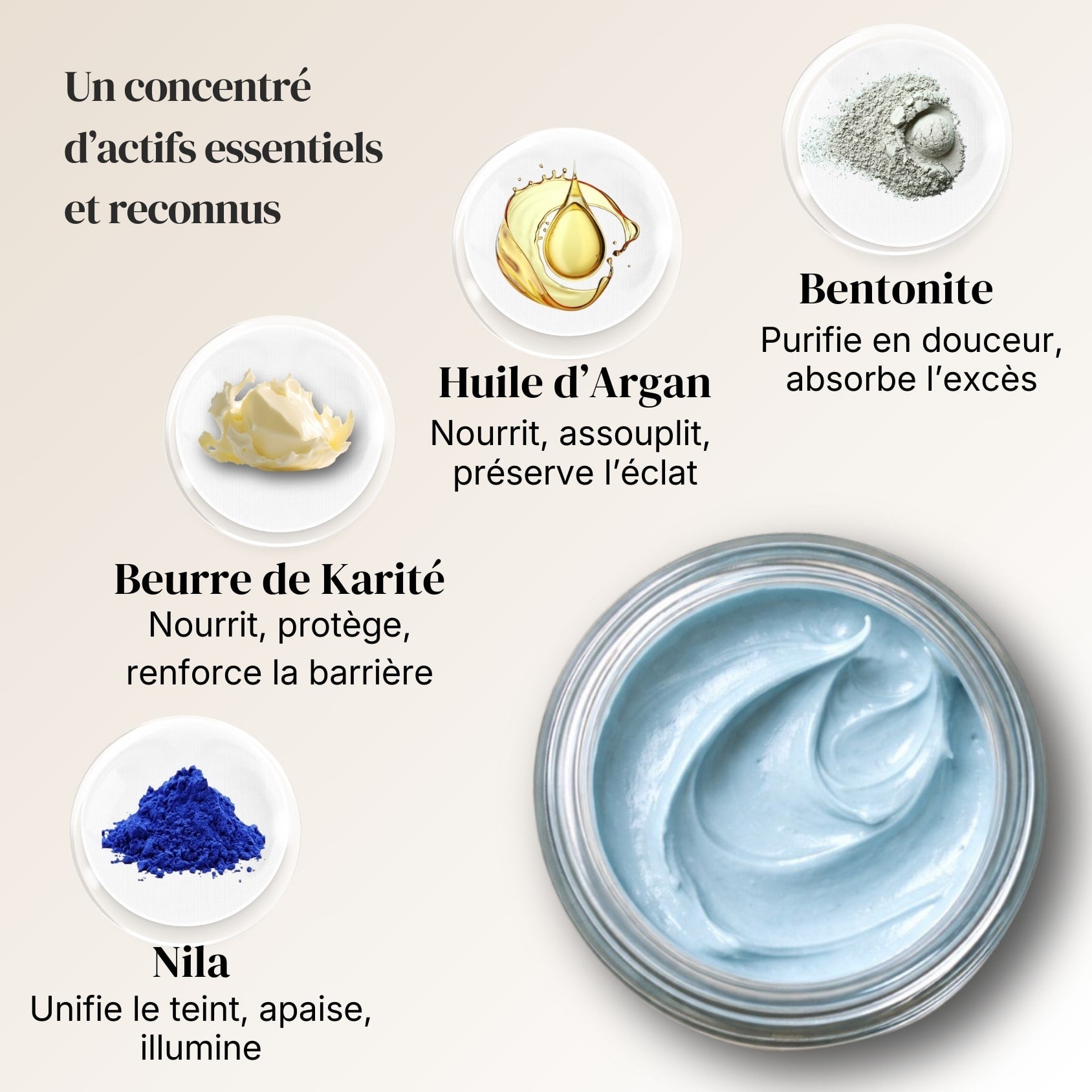 Associé à une argile purifiante douce, à des huiles nourrissantes et à des actifs naturellement riches en antioxydants, le Nila agit en synergie pour aider la peau à retrouver confort, éclat et stabilité, sans jamais la brusquer.